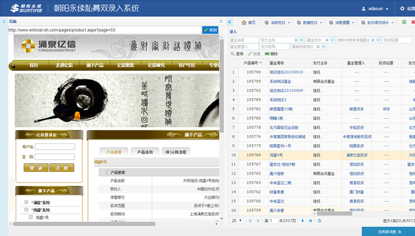 朝陽永續(xù)私募雙錄入項目是重構(gòu)項目,主要用來實現(xiàn)基于金融報告等的數(shù)據(jù)的錄入、校對。系統(tǒng)實現(xiàn)了管理員對錄入和校對人員進行授權(quán)并對錄入人員進行分組,錄入人員1和錄入人員2使用平臺錄入數(shù)據(jù),校對人員進行校對、扣分、一致提交入庫等操作。系統(tǒng)通過雙錄入和校對機制從而減少了數(shù)據(jù)錄入的錯誤率,提高了數(shù)據(jù)準確性。